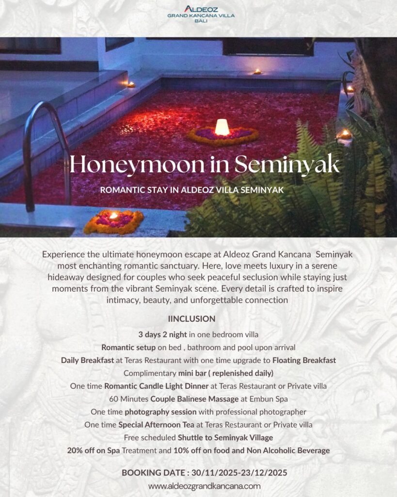 A Romantic Tropical Escape in the Heart of Seminyak — Your Private Pool Villa Sanctuary Discover a romantic tropical hideaway in the heart of Seminyak. Aldeoz Grand Kancana Villa offers private pool villas surrounded by lush greenery — a peaceful escape with a touch of elegance.